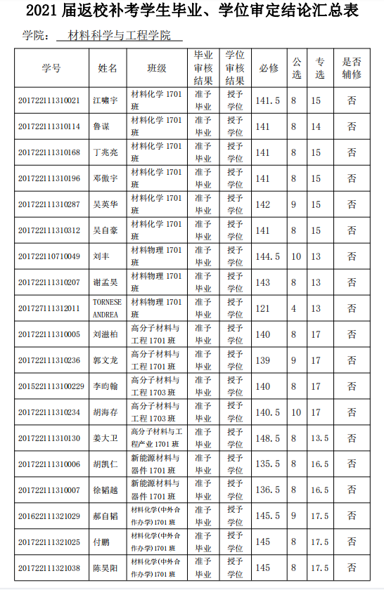 材料公司2021届返校补考员工毕业、学位审定结论公示 | |