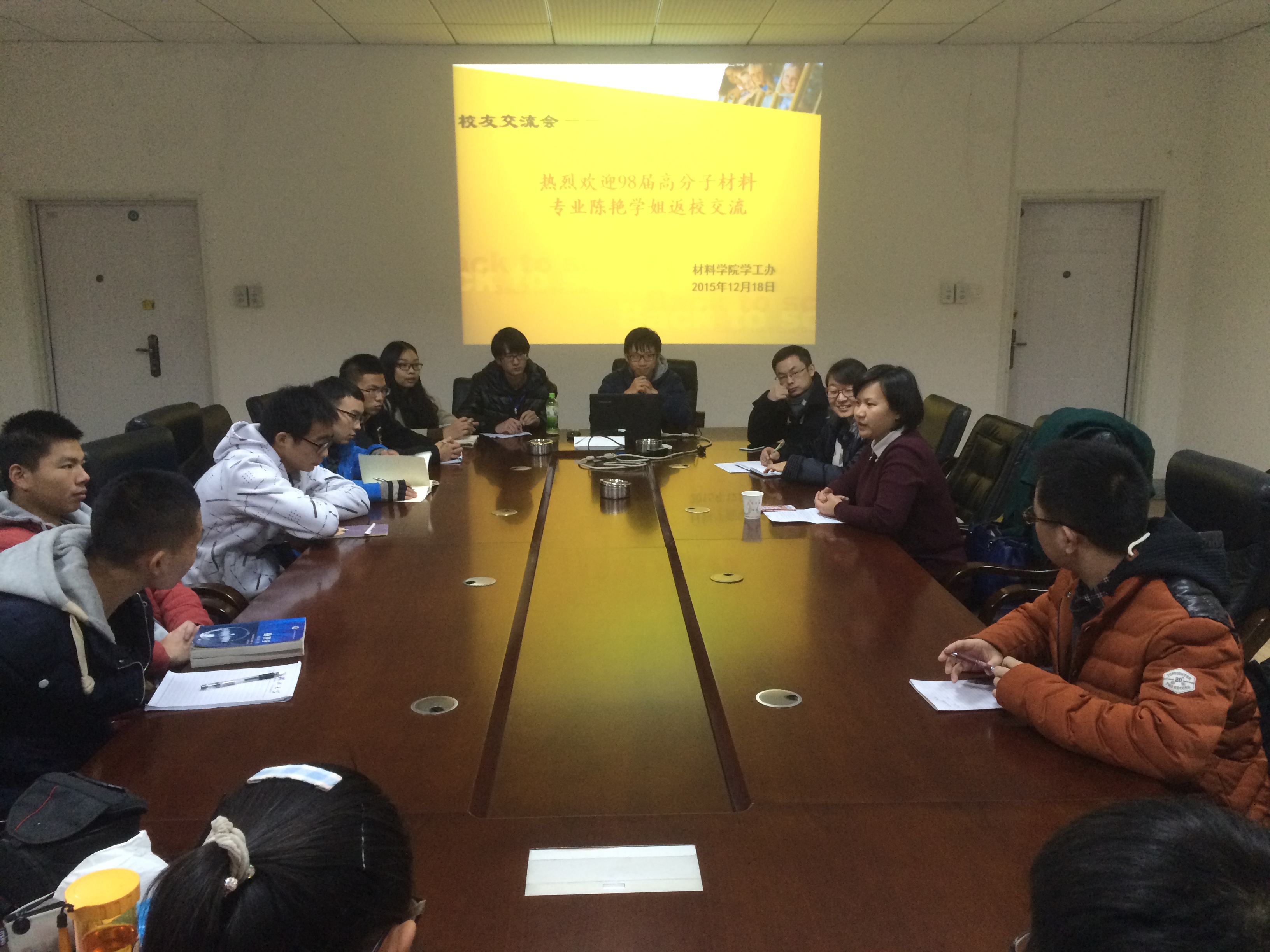 2015年12月18日下午,陈艳师姐员工交流会于材料公司二楼会议室举行。材料公司党委书记何顺进、党委副书记陈琴及2014级员工参加了此次交流会。