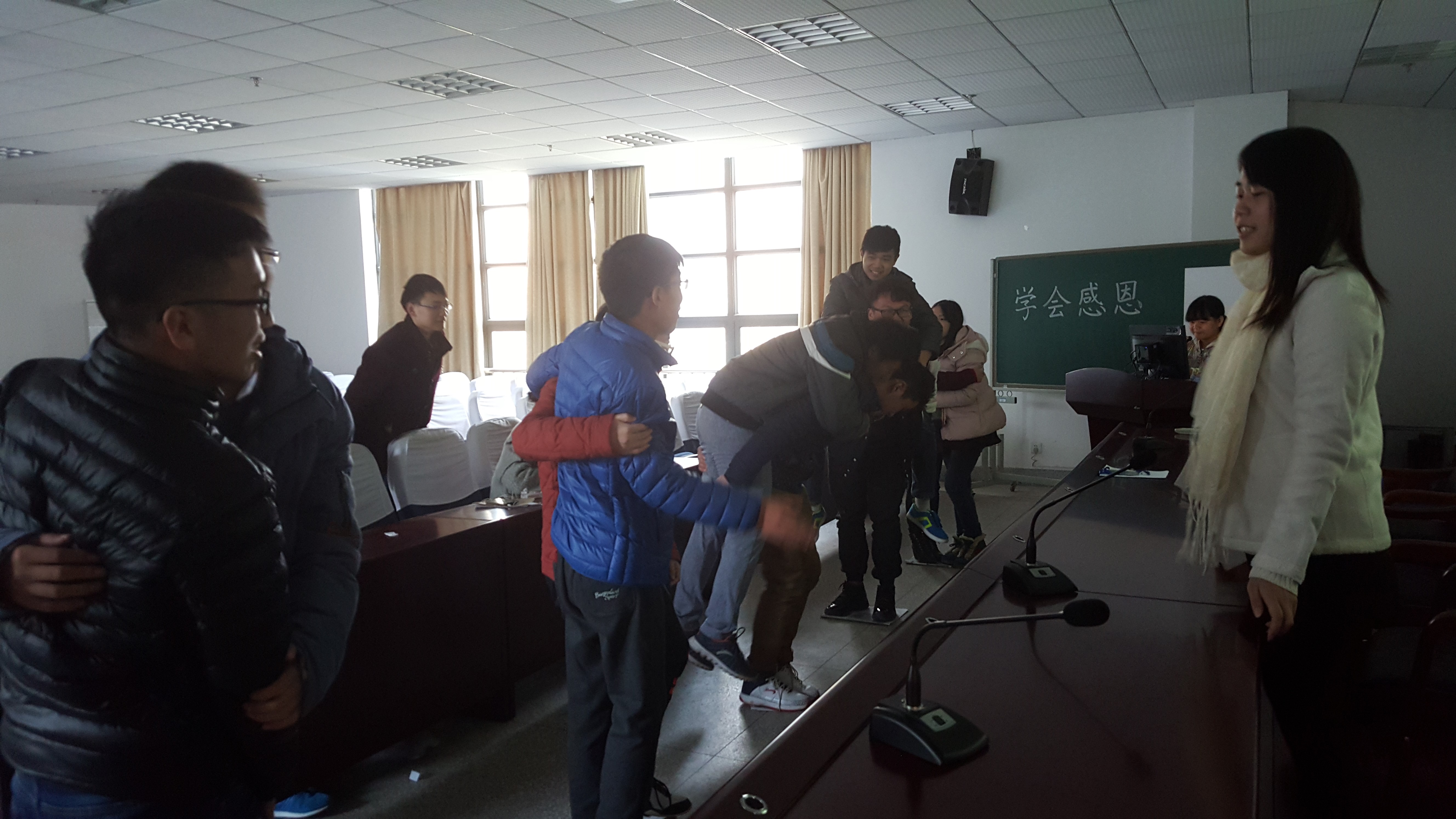 ——记14高材(1)班感恩节团日活动 11月26日星期四下午,暨西方的感恩节,14级高材一班在材院大楼二楼学术报告厅举办以“我的心,为你融化”为主题的感恩节活动,以增强同学们的感恩意识、培植感恩情怀、营造一种“人人为我,我为人人”的良好风气。 活动主持请梅昊成同学为大家讲《一杯牛奶》的故事,同学们都听地津津有味,感想颇多。“这个故事深深地触动了我,生活中也不乏这样的爱,我们需要留意身边的每一份关爱,学会知恩图报,懂得感恩。”来自赵侃同学这样说道。由此引出该活动主题,伴着唯美动听的轻音乐,结合一张张ppt的播放,主持的柔和解说介绍,在感恩父母的篇章中,列举了一系列为父母做的事,反问同学们都做到了吗,播放一段以感恩的心为背景音乐的动漫,同学们都潸然泪下。 紧接着感恩老师,全体同学起立向班主任周老师鞠躬说“谢谢”,感谢老师的传道授业解惑和辛劳奉献,整齐而响亮的一句“谢谢”道出了同学们对老师深深地敬意和感谢,周老师也热泪盈眶,被同学们的一举一动感动了。 感恩朋友,生活因朋友而精彩。在此过程中,进行了一次抢答叠报纸的游戏,每个同学都参与其中,每一个人都笑得合不上嘴,同学的默契配合,相拥一起,顺利完成了游戏,给同学们带来了不少乐趣。 感恩生活,感恩社会,以最美的姿态积极的生活,少一分抱怨,多一分珍惜,回馈社会给我们带了的一切。作为一个受过高等教育的老员工,一个社会公民,做力所能及的事,回报社会。还有于小燕同学分享参加“共同托起明天的太阳”公益活动的感受,结合此次活动不禁地留下感动的泪水。 最后周老师给我们分享了一些生活中的真实故事,告诉我们心怀感恩,心系他人,学会尊重他人,尊重对手,学会包容。爱是用心感受别人的需要,学会感恩,我的心为你融化。 通讯员:卢静颀