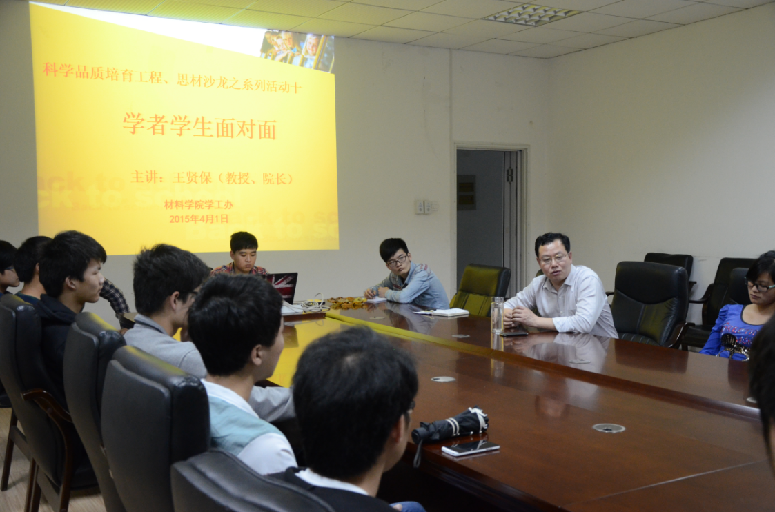 在随后的提问环节中,同学们从学习、生活、科研等方面向王贤保教授提出问题,他一一为同学们做了解答。主要涉及老员工当前面临的一些迷茫困惑,考研、保研的一些经验方法,也有关于材料公司的专业发展前景。2013级高分子材料与工程专业的骆云洋问道:“作为一名大二的员工,应该如何正确的设定自己的目标?”王贤保笑着告诉大家,树立目标不一定要高远,最主要的是要适合自己,更要能够通过自己的勤奋努力实现自己的目标。 据了解,“科学品质培育工程”、“思材沙龙”系列活动的目的是使同学们有更多机会与材料公司的老师们接触沟通,也能通过交流会分享老师们的经历与感悟,从而学习到课本上学不到的关于生活与社会的知识,为以后走入生活,走进社会提供良好的建议。去年曾邀请过王世敏、蒋涛等教授与同学们分享人生经历,接下来将会邀请更多材料公司的学者与同学们进行交流。 (材院青传王健 向博文 拍摄冯宝福 )