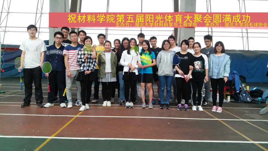 ——记材院第五届“阳光成长体育大聚会”羽毛球比赛顺利举行 为丰富材院教职工及员工的课余文化生活,营造良好的校园文化氛围,近日,由材羽毛球协会举办的第五届“阳光成长体育大聚会”羽毛球比赛于3月21日举行。 本次比赛分为男单、女单、男双、女双、混双5个项目,由14、15级高材一、高材二、高材三、材化、材物无机非、新能源产业器件各一支队伍,及15和16级材化国际班一支队伍,并13级一支队伍共十四支队伍进行团体循环联赛形式。