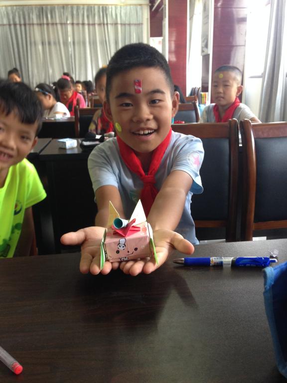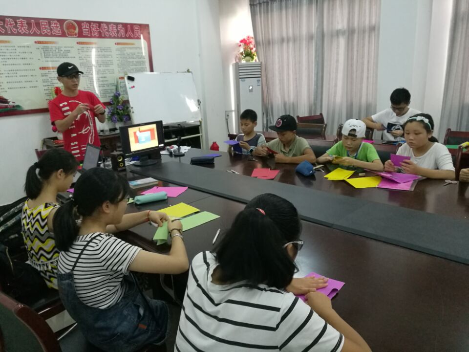 (志愿者辅导员工做作业) 除了在课堂上为员工们带来或诙谐幽默或严肃正经的各种课程之外,课下,志愿者们更是员工们亲密无间的大哥哥大姐姐。每次下课,志愿者们都会收到员工们亲手折的折纸作为小礼物。志愿者徐康是孩子们中的人气王,每次下课小朋友们都会簇拥而上拉着他聊天。当被问及被这么多小朋友喜欢有何感受时,他显得有些羞涩:“能够被这么多小朋友喜欢真的让我觉得很开心。小孩子都很天真活泼,他们的笑脸,给了我支教更大的动力。”