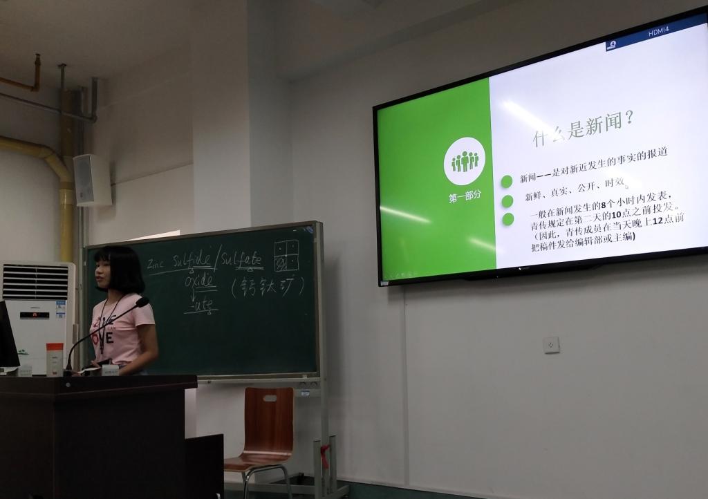 9月13日中午12时,材料科学与工程公司青年传媒中心在材院3楼3026教室召开“青传专业技能‘浅度’培训”会议。15级负责人和16级青传成员参加了此次会议。 会议开始,主讲人胡春艳先就上一年青传的工作向同学们作了简要的汇报,然后用PPT的形式向16级新成员介绍了什么是新闻、新闻写作的六要素(“5W”+“1H”)、稿件的格式以及注意事项等。她强调,写新闻稿切忌带入自我,作者要做一名“第三者”,即保持“零度情感”,文风追求“骨干之美”等等。与会同学结合自身的理解也提出了各自的疑问,主讲人都一一耐心解答。
