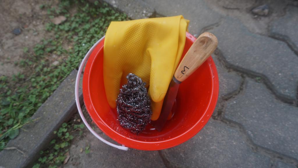 每个小广告的聚集地分别由三位同学为一组负责清扫,每个小组都分配有一个小桶、一双塑胶手套、一个钢丝球和一把小铲子。志协的部员陈智慧、毛爱娇和伍业峰负责的是材院大楼附近的小广告清扫工作。三位同学从小广告数量最多的墙面开始清扫。先用铲子刮开小广告的边缘,再顺势撕下,残留的痕迹就用钢丝球摩擦,直至墙面完全干净。有些贴得过高的小广告不易清理,伍业峰同学建议用撘人梯的方式进行清理,但考虑到操作有一定危险性只好作罢。近一小时的清扫工作后,大部分小广告已被清除。虽然少许墙面因操作不便,工具准备不足,没有完全清理干净,但是志愿者们承诺下次想出解决办法进行清理。