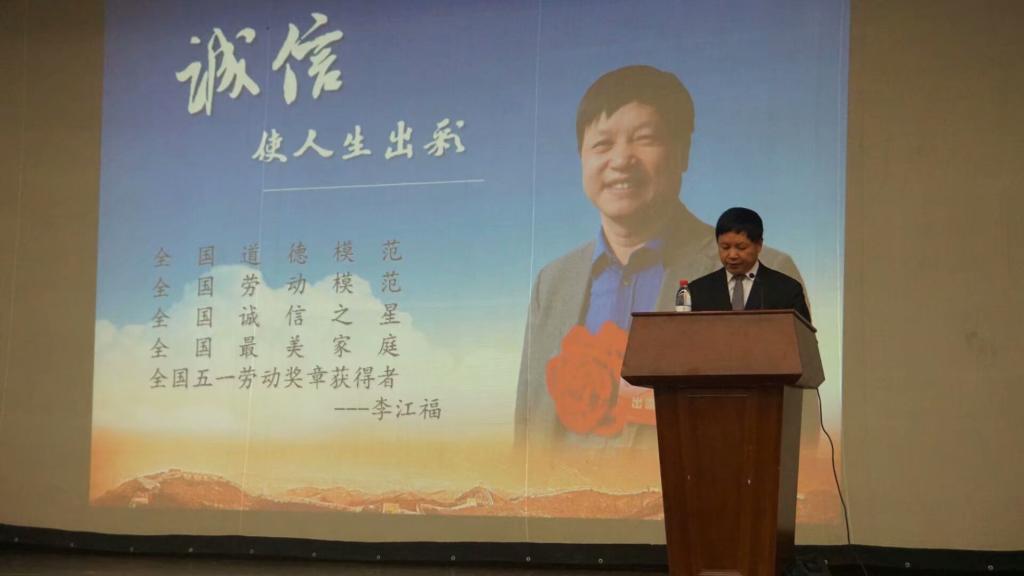 李江福,中共党员,中央党校在职研究生学历,高级工程师、高级经济师、国家注册一级建造师。1985年跟随林县的“十万大军”投身建筑业,先后荣获“第五届全国道德模范”、“全国劳动模范”、“全国诚信之星”、“全国五一劳动勋章”等荣誉称号,2008年入选中国好人榜,现任河南新城建设有限公司项目经理。 陈琴对李江福进行简单地介绍之后,李老师以“诚信,使人生出彩”为题,结合自身投身建筑业、支援抗争救灾等亲身经历向在座员工阐述了“诚信”对人生成长、事业发展的影响。并从“人过留名,雁过留声”、“讲诚信不吃亏,讲诚信,天地宽”、“要对得起自己的良心,绝不拖欠农民工一分钱”、“做人不仅要盖诚信大厦,还要当诚信的种子”等四个方面告诫员工们:讲诚信,能够使人生更加精彩。