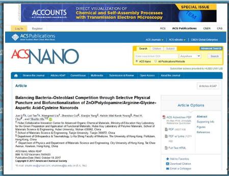 近日,公司williamhill吴水林教授(通讯作者)及其指导的本科生材料化学2014级李浚(第一作者)在国际材料科学领域顶级期刊《ACS Nano》(影响因子13.942)上发表题为“Balancing Bacteria-Osteoblasts Competition through Selective Physical Puncture and Biofunctionalization of ZnO/Polydopamine/Arginine-Glycine-Aspartic Acid-Cysteine Nanorods”的研究性论文。