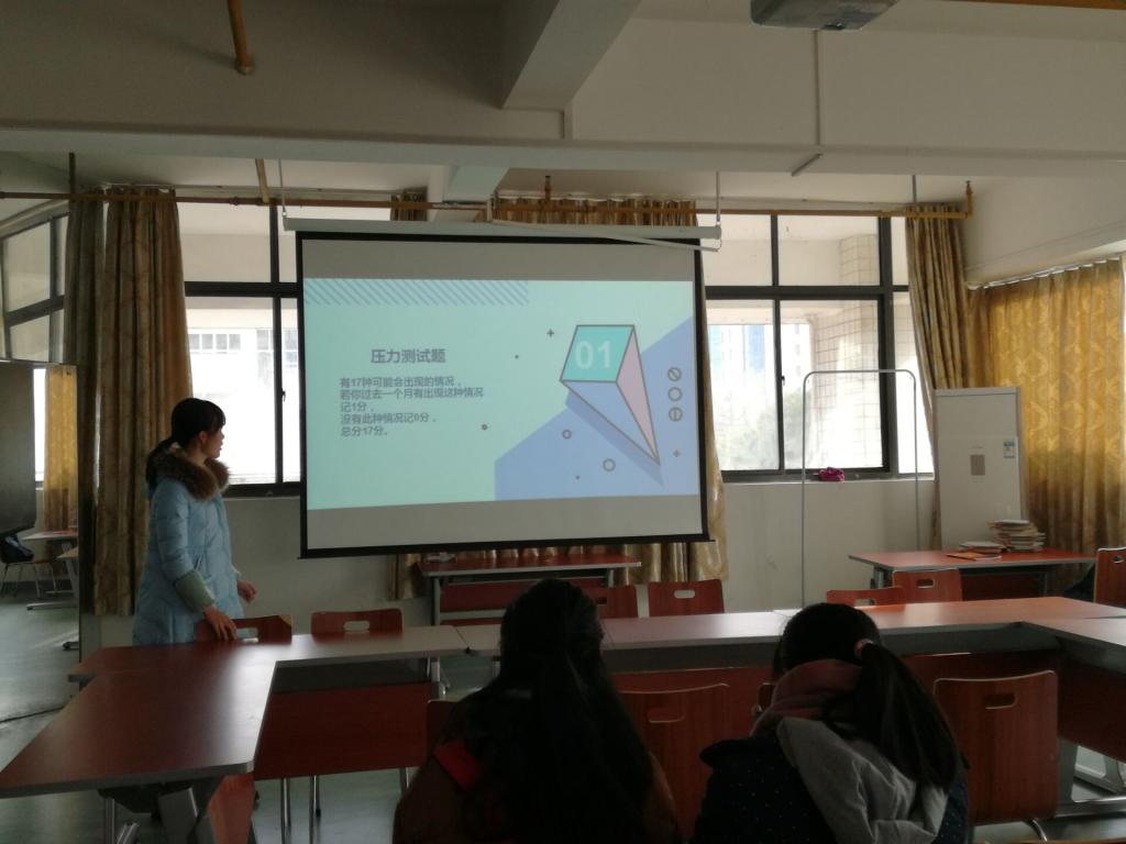 班会开始,心理委员先对每个人做了简单的心理压力测试,使每个人都了解自己的压力状况。接着便列出了一些排解压力的方法:听一听音乐,找个知心朋友倾诉或是自我暗示,以此来排遣自己的压力。时间一分一秒过去,随后便来到了第二个环节,两个小游戏。游戏开始,将同学们分为几个小组,经过一分钟的准备之后,让每个小组的第一个同学说出自己的爱好,然后第二个同学重复前一位同学的爱好并说出自己的爱好,再由下一位同学接下去,哪一组用时最多,说错次数最多,便在第三个环节中担任同学们的咨询对象。游戏过程中,同学们欢声笑语,整个教室里充满了欢快的气氛。第三个环节则是心理咨询,同学们在班级QQ群中匿名发出自己想要询问的问题,再由上一环节中被选出的同学来解答。一问一答,时间飞逝,当心理委员宣布活动结束时,同学们还意犹未尽,纷纷表示希望班级举办更多这样的活动。