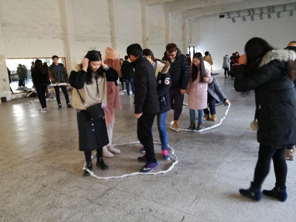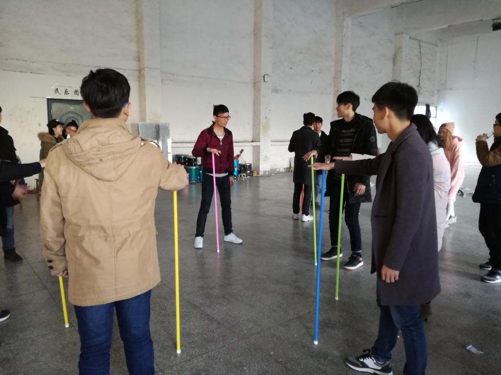 活动开始,每个人随机领一瓶饮料,并通过瓶底标出的号码分成6组。随后在主持人简单的开场白后,同学们便以组为单位相互自我介绍,经过几分钟的熟悉后,就迎来了期待已久的游戏环节:“游戏报纸履带”、“神笔马良”、“指压板接力”、“不倒森林”和“面粉吹球拔河”。