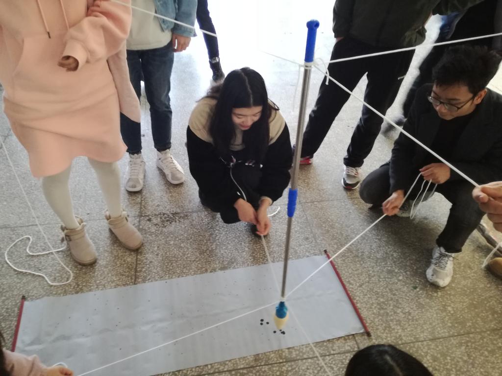 接下来是第二个游戏“神笔马良”,每个小组用绳子系在一只大毛笔的上下两端,然后一起通过拽动绳子来控制毛笔写出“商材”两字,凭借同学们默契的配合与锲而不舍的精神终于完成任务,展示了商材两院员工会的友谊。 经过短暂的休息,同学们有条不紊地开始了第三个游戏“指压板接力”。这个游戏中,同学们需要脱掉鞋子,在指压板上跑过,最后一名男同学还需要背着一名女生通过指压板,整个游戏过程中充满着同学们的尖叫与欢笑声。