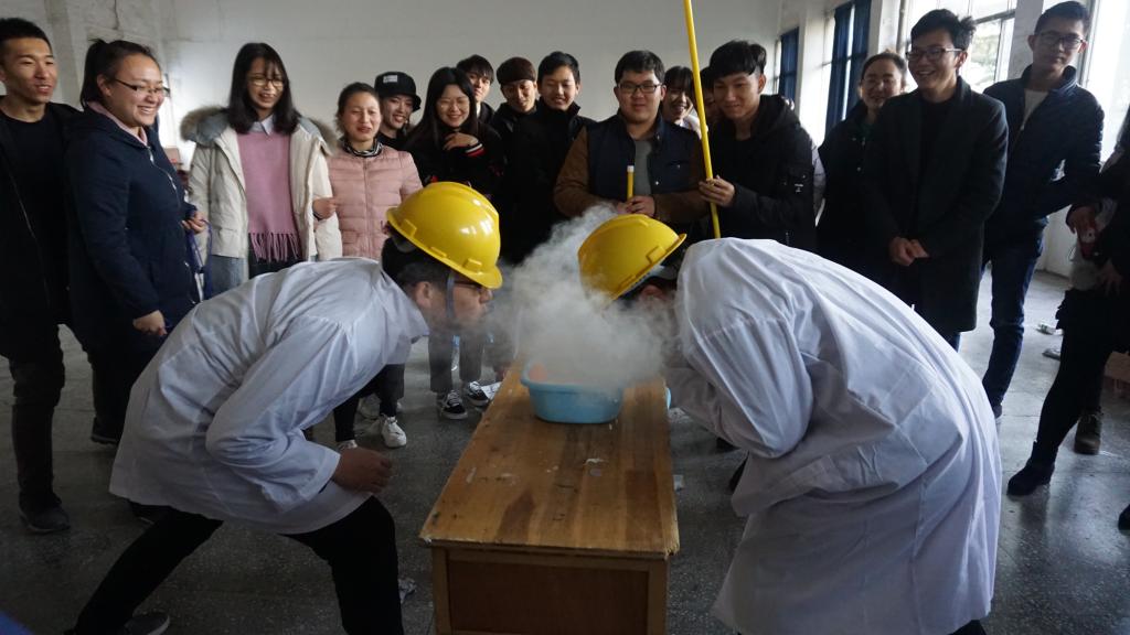第四个游戏“不倒森林”,小组成员需要用手撑着一根杆子围成一个圈,听到口令后松开自己的杆子去扶住下一个队员的杆子,最后选定圈最大的小组优胜。“3,2,1”随着口令喊下,小组成员迅速松开自己手中的杆子,跑向下一位队员原站立处,并伸出手去抓住快要倒下的杆子,“哐当”“十分抱歉,一下子没抓住”“没事,再来,这次一定成功!”。一双双鼓励的眼神,给人巨大的力量,“3,2,1”“欧也,干得漂亮”。简单的食物补给后便是最后一个游戏“面粉吹球拔河”,每一组选出一名同学,在装满面粉的盆中将其中的兵乓球吹到对方的区域落下即为获胜。代表们全副武装:安全帽,白大褂。随着裁判的一声开始,两名同学都迅速弯下腰,吸气,呼气,场中瞬时白粉漫扬,“咳,咳”待面粉散去,乒乓球还是在盆中央纹丝不动,但两人的脸上已是一片白茫茫,观战的同学都笑弯了腰。