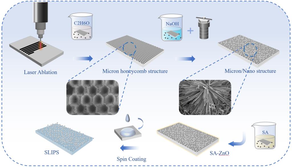 图 蜂窝状注油表面的制备方法 全球淡水资源面临严峻的水安全挑战,缺水会扰乱河流流量、生态系统功能和粮食安全,从而破坏经济发展。此外,极端天气频发,结冰和结霜给人类的日常生活带来不便,道路上的积雪和结冰导致交通受阻,电力系统因冻雨天气瘫痪。简单高效地获取清洁淡水资源和制备一种耐用的抗结冰表面具有重要意义。基于绿色低碳的发展理念,受蜂巢结构启发该研究团队成功的制备了一种多维润滑剂注入表面,它具有良好的润滑剂锁定能力,同时还具有出色的机械耐久性,成功地实现了长期有效的雾水收集和抗结冰。针对单一的二维注油表面,该团队制备了一种受蜂窝结构启发的耐用注油表面,制备过程如图1所示。在基底上通过激光刻蚀的方法制备出了具有优秀机械强度和高比表面积的微米级蜂窝状结构,然后在蜂窝状结构中制备了纳米级松针状ZnO,在经过硬脂酸改性后得到了超疏水的微纳米复合结构,最后注入二甲硅油得到了高耐用性的注油表面并且具有优异的抗结冰和雾水收集性能。 郭志光教授多年来在仿生摩擦学领域研究,取得了系列进展。现任Bio-design and Manufacturing, Journal of Bionic Engineering 和Friction杂志副主编,兼任Chen. Letter.、Biosurface and Biotribology、Advanced Bionics、摩擦学学报、中国表面工程等杂编委,主持承担国家自然科学重点基金项目、优秀青年科学基金项目和面上项目等。在Chem. Soc. Rev.,JACS,Adv. Mater.和摩擦学报等国内外刊物发表学术论文520余篇,SCI引用2万多次,H因子75。出版中英文专著各一部。 论文链接:https://doi.org/10.1016/j.cej.2024.15147 (审稿:陈亮) |
