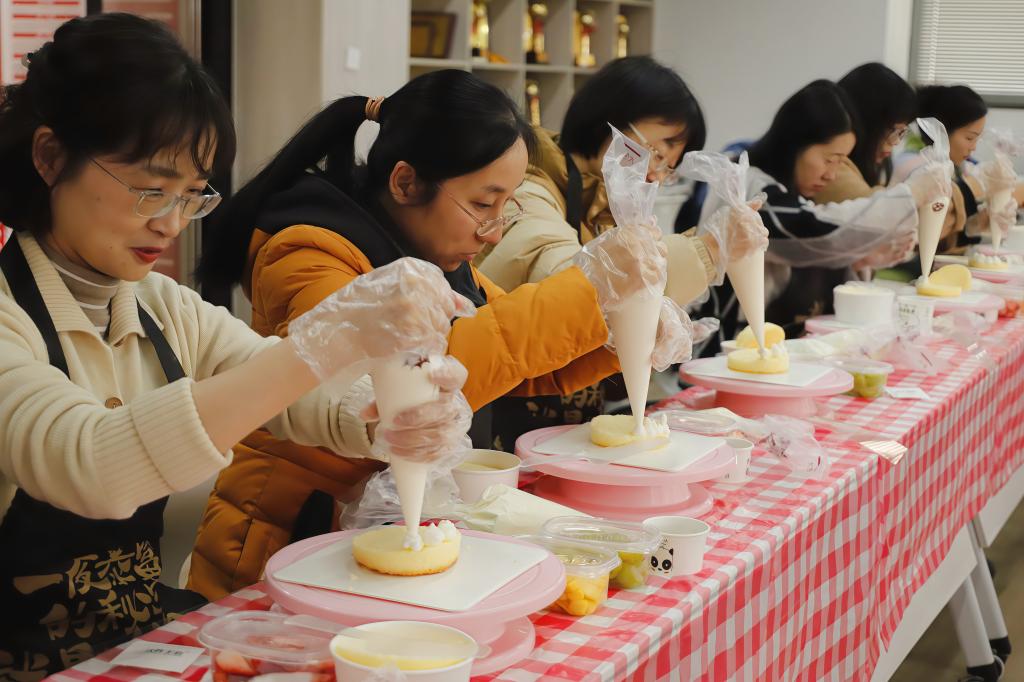 “我们做实验追求精准,没想到做蛋糕也同样要有耐心!”一位女教师发出这样的感叹,引得全场哄堂大笑。 3月7日上午,在材料公司党群活动室,一群平日里在实验室、讲台严谨认真的女性教职工们,化身为了快乐的甜点师。她们脸上洋溢着幸福与喜悦的笑容。桌面上摆满了各式各样的蛋糕胚、奶油、水果和装饰物。女同胞们小心翼翼地拿起奶油裱花袋,将雪白的奶油均匀地挤在蛋糕胚上,手法虽然略显生疏,但那份专注与认真却让人动容。