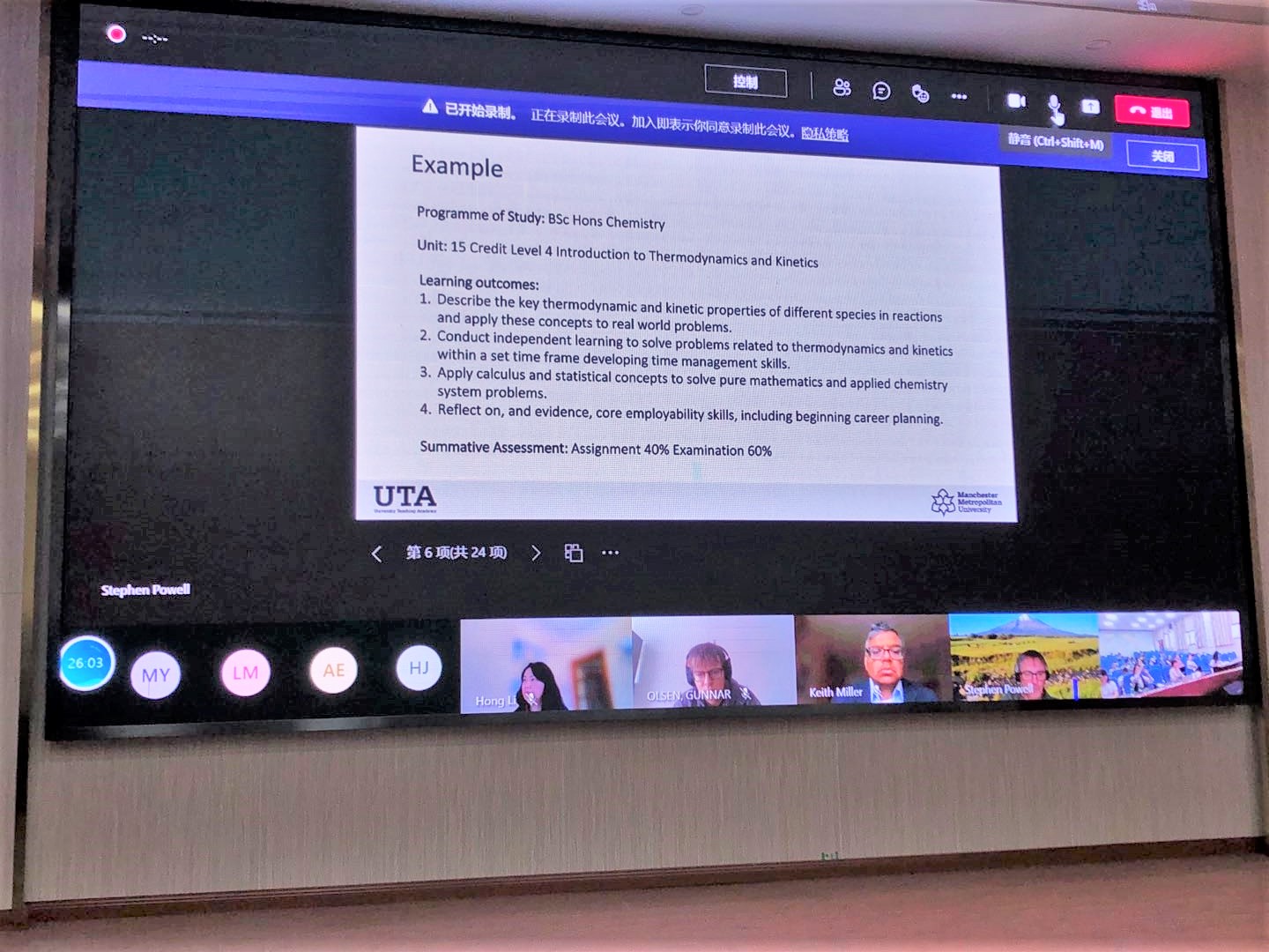 5月25日下午,材料化学中外合作办学教师参加williamhill官网曼城联合公司教学研讨会。本次活动由湖大曼城联合公司主办,会议于湖大曼城联合公司三楼报告厅召开,采用视频会议的方式进行。会议听取了英国曼彻斯特城市大学理工学部副部长Keith Miller教授和Stephen Powell教授的报告,双方老师就两校在教学管理、教学设计、员工反馈等各方面的操作流程、管理规范、评价方式等进行了深入的交流。