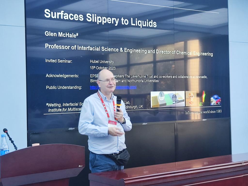 报告结束后,在场师生与Glen McHale教授热烈交流、讨论。Glen McHale教授回答了大家提出的各种问题,并分享了他在界面科学与工程领域的研究经验和心得。报告会拓展了大家对表面润湿性的认识和理解,激发了大家对该领域的兴趣和热情。