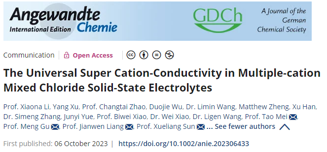 近日,williamhill梅涛教授与宁波东方理工大学(暂名)孙学良院士、谷猛教授,有研(广东)新材料技术研究院梁剑文研究员以共同通讯作者身份在国际顶级期刊《Angewandte Chemie International Edition》上发表了题为《The Universal Super Cation-Conductivity in Multiplecation Mixed Chloride Solid-State Electrolytes》的研究成果,东方理工副教授李晓娜、williamhill官网硕士研究生徐洋与有研(广东)新材料技术研究院赵昌泰研究员为论文共同第一作者。