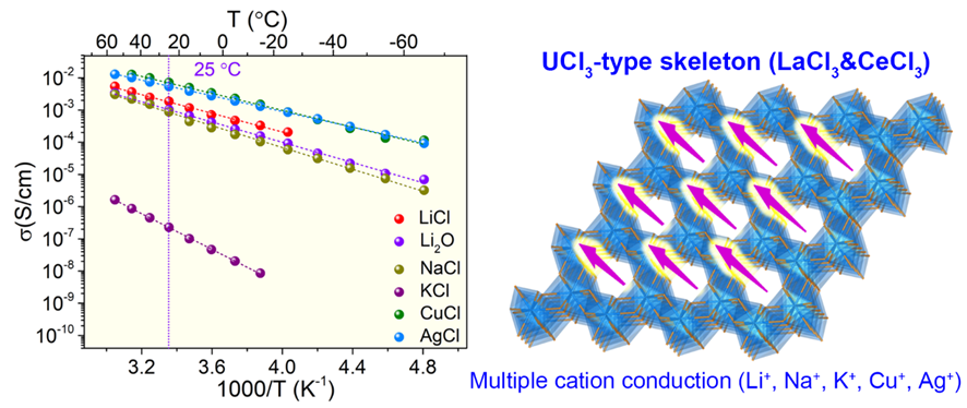 全固态锂二次电池(ASSLBs)因其高安全性、高能量密度和在较宽的温度范围内的应用而具有吸引力,而固态电解质(SSEs)作为ASSLBs的重要组成部分,引起了人们对无机SSEs领域极大的兴趣。近些年来,金属卤化物电解质LiaMXb(M=Y, Sc, In, Zr, etc., X = Cl, Br)凭借其超过10-3S/cm的室温离子电导率,宽的电化学窗口及与金属氧化物正极优异的界面稳定性得到了更广泛的研究。大多数目前报道的超离子卤化物SSEs主要是基于紧密排列的阴离子亚晶格,形成单斜晶(Li3InCl6,Li3ScCl6),正交晶(Li2.5Y0.5Zr0.5Cl6,Li2.73Ho1.09Cl6)和三方(Li3ErCl6,milled-Li2ZrCl6)结构。然而,这些已经报道的卤化物SSEs只是含有一价阳离子的三元卤化物的一小部分(Li+,Na+等)。在众多的三元卤化物晶体结构中,UCl3型结构具有丰富的通道位点,可以容纳单价阳离子和提供迁移路径得到了广泛的研究。