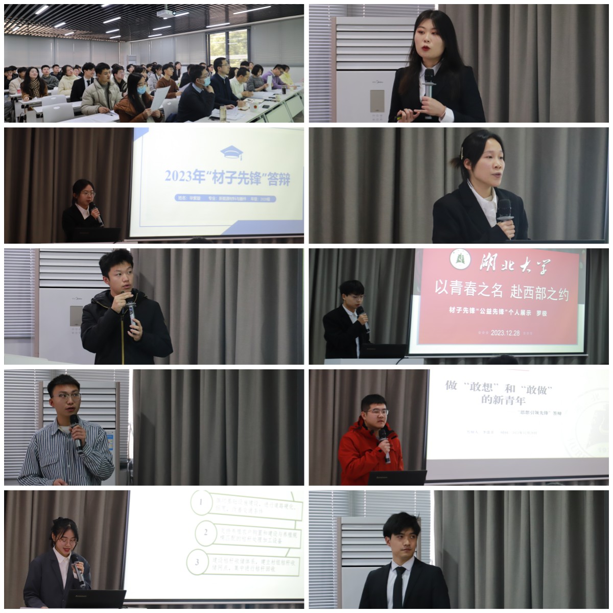 本次答辩共15组员工参与,通过PPT展示,候选人在向上向善、勤奋学习、志愿实践、学术科研、创新创业、文艺体育等方面进行分享,充分展现了材院学子积极向上的精神风貌和多元发展的青春风采。 经答辩评议及线下公示,最终授予李涤非“思想引领先锋”、邢紫晗“学习先锋”、傅烨“科研先锋”、毕紫璇“创新先锋”、“再秸再利”社会实践团队“实践先锋”、罗级“公益先锋”、黄苏继“文体先锋”、杨瑞鹏“服务先锋”、庞子琪“自强先锋”荣誉称号。