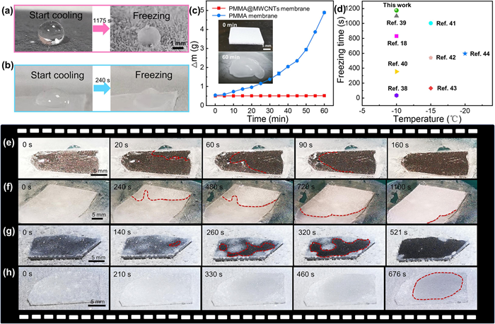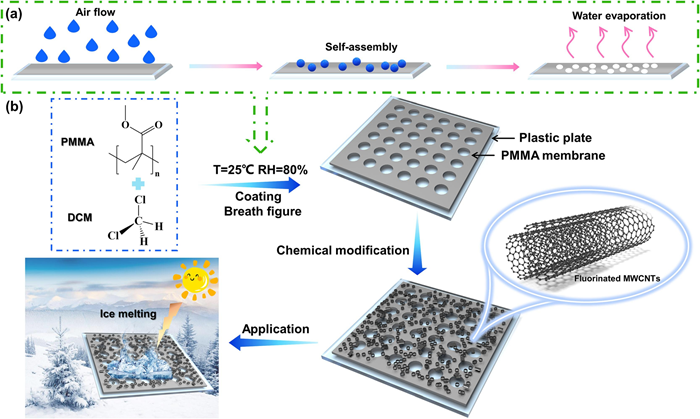 超疏水表面独特的微纳结构可以在结冰前将撞击或凝结的水滴弹开,这大大延长了结冰时间。然而,高湿度环境中的结冰行为可能会导致表面微观结构的空气层被冷凝物和冰占据,使超疏水表面失去防结冰能力。因此,具有单一拒液性能的传统超疏水表面无法满足先进技术应用中快速发展的要求。在这项工作中,团队提出了一种使用呼吸图制备多孔PMMA 膜作为基底,然后在PMMA膜表面喷涂一层FAS改性的MWCNTs,从而得到光热超疏水膜的制备方法。