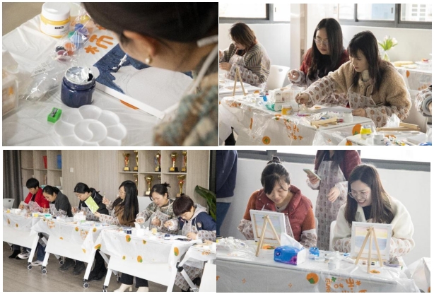 三月春暖芬芳沁,万紫千红释锦华。为庆祝第114个“三八”国际劳动妇女节,丰富教职工们的精神生活,公司工会为全体女性教职工精心组织了“绘画美员工活会”活动。 活动伊始,公司党委书记陈亮和院工会主席常钢为女教职工送上了节日的祝福。随后,在指导老师简要讲解丙烯肌理画的技巧和配色后,老师们也开始了自己的创作。经过一小时左右的创作,一幅幅画作相继“出炉”,靓丽多彩,生动活泼,令人赏心悦目。
