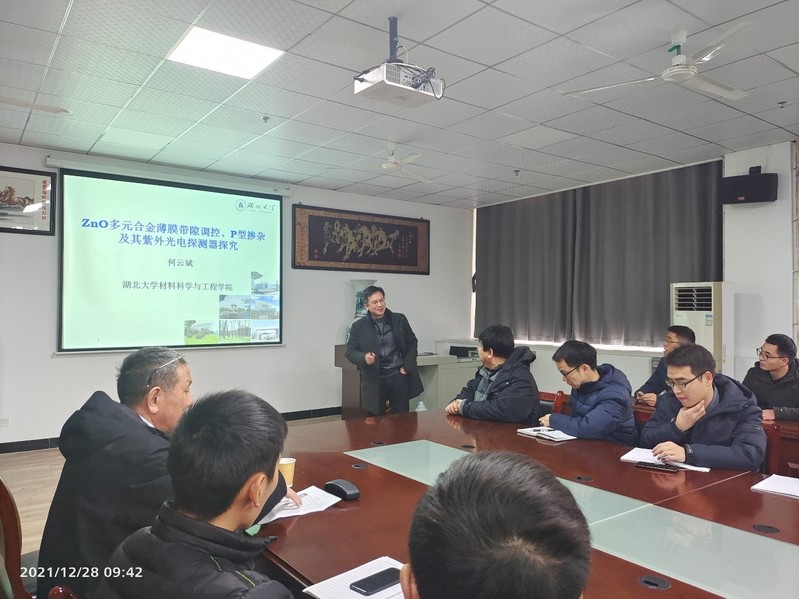 2021年12月28日,应湖北师范大学先进材料研究院的邀请,何云斌教授到访该公司。交流访问期间,何云斌教授作了题为“ZnO多元合金薄膜带隙调控、P型掺杂及其紫外光电探测器探究”的学术报告。该院先进材料研究院、物电公司部分教师、研究生聆听了报告。报告会上何云斌教授细致全面地介绍了他们课题组多年来在ZnO材料方面的研究成果,通过制备ZnO的多元合金薄膜实现了对ZnO带隙的调控、并且实现了稳定的P型掺杂,这些成果为ZnO材料在新型紫外光电探测方面的应用奠定了基础。报告结束后,何云斌教授与在场师生就相关问题进行了深入的讨论。