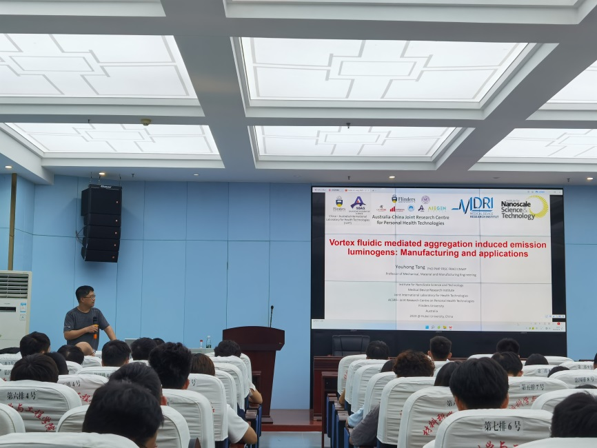 “Aggregation-induced emission(聚集诱导发光)”是由香港科技大学唐本忠院士提出的具有原创性的新概念、新理论,是由中国科学家引领的新兴热门研究领域,AIE与不同纳米材料制备技术结合有利于制备具有新奇发光现象的纳米聚集体并由此深化对AIE发光机理的认知和研究。报告中,唐友宏教授从AIE现象的发现出发,介绍了AIE材料的发光特性和发光机理,之后重点讲述了一种新颖的涡旋射流设备在AIE中的应用。其课题组通过该设备对AIE发光材料进行加工,可制备出粒径更小、发光效率更高的纳米聚集体,从而在保证发光效率的同时减少AIE染料的使用量。报告中唐教授详细分析了离心力、电场、磁场等外界作用对AIE发光材料结构和性能的影响,最后与在场师生展开了热烈的讨论,并展望了两校合作的各种机会和可能性。 唐友宏,教授,博士生导师,澳大利亚弗林德斯大学(Flinders University)材料工程学教授,纳米级科学技术中心和医疗器械研究所研究负责人。曾获得澳大利亚研究委员会授予的ARC-DECRA奖。唐友宏教授2007年在香港科技大学获得博士学位,2009年升为华南理工大学副教授,2011年担任悉尼大学先进材料技术中心研究员,2012年就职于弗林德斯大学。2018年获英国皇家化学会会士、2021年获澳大利亚皇家化学会会士称号。其研究涉及机械、材料、制造工程等多个领域,主要集中在(1)高分子(纳米)材料的结构–加工–性质关系,(2)具有聚集诱导发光特性的生物材料、生物传感及其器件等方面的内容。 (审稿:施德安) |